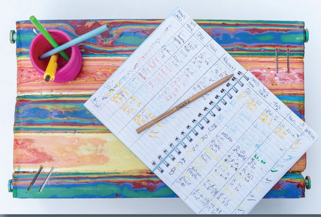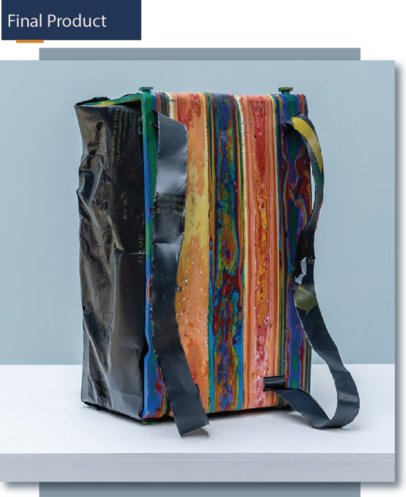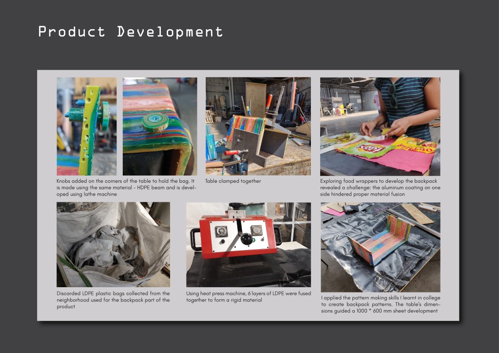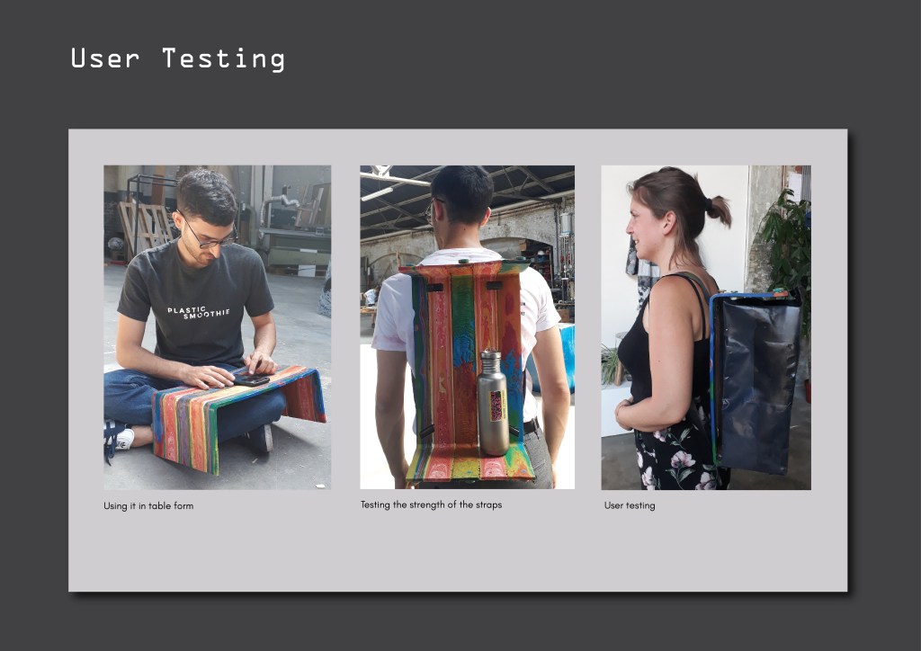 The straps of the backpack are designed to be playful like the table. Print is made using leftover LDPE bags. Once the backpack and the table were ready, it was attached together using the knobs on the table, which also act as a button for the backpack. Precious Plastic added it’s stamp on the product for easy identification of the materials used in the product.