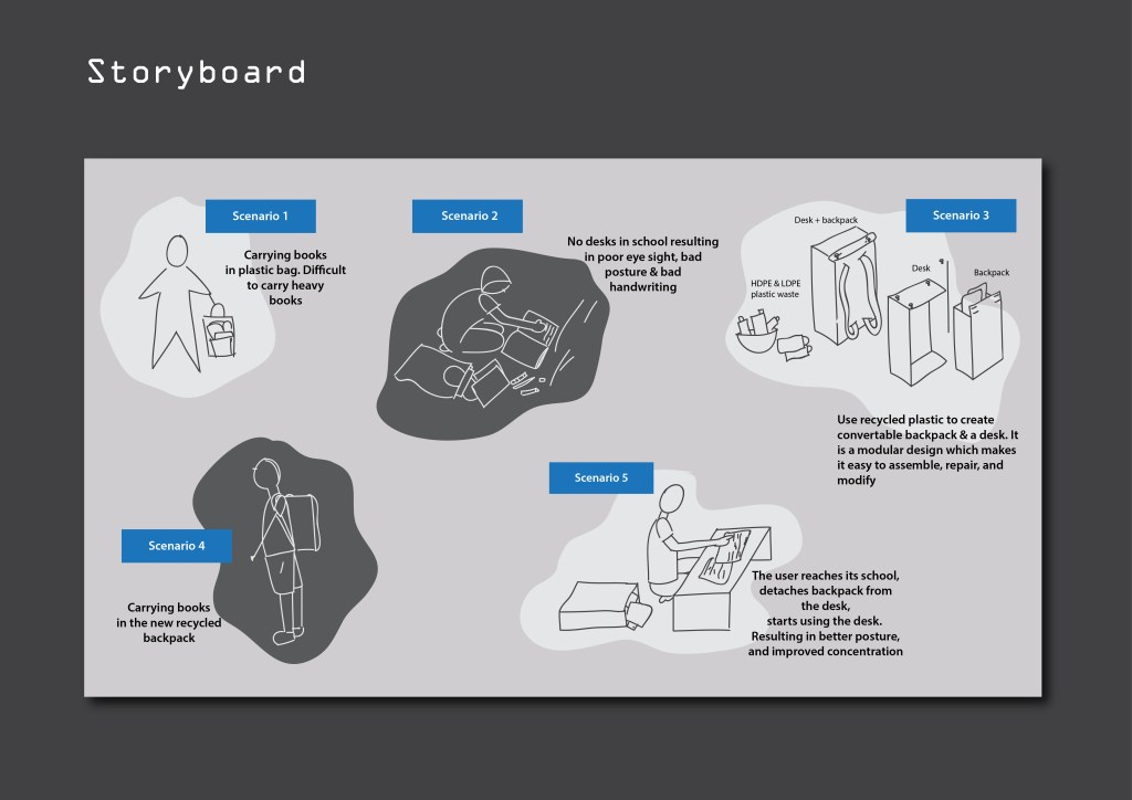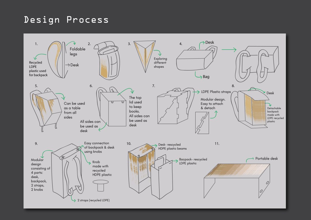 Keywords: recycled plastic, social innovation, underpriviliged, convertable backpack & desk, portable, creative, environment friendly, product design